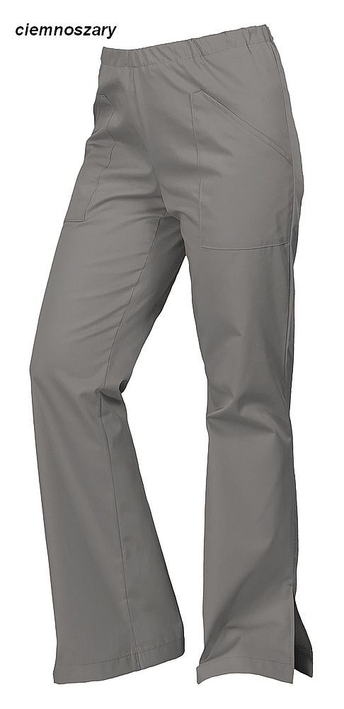 Rozszerzana nogawka typu dzwony z rozcięciem u dołu nadaje spodniom lekkości i nowoczesnej formy, jednocześnie zapewniając swobodę ruchu. Taki krój odzieży medycznej sprawia, że model dobrze prezentuje się zarówno jako samodzielny element, jak i w zestawie typu żakiet medyczny ze spodniami, tworząc estetyczny mundurek.