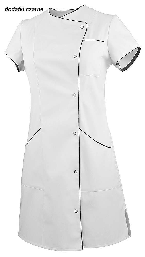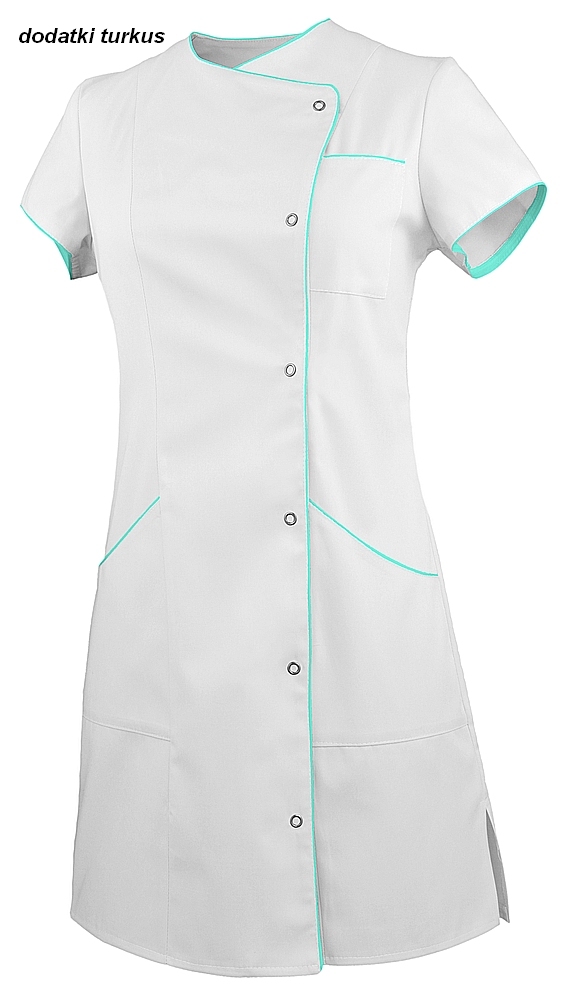 Tunika medyczna / kosmetyczna, zapinana na springi, zapięcie asymetryczne przesunięte w lewą stronę, z krótkim rękawkiem, trzy kieszenie. Tunika wykończona rozcięciami na bokach.